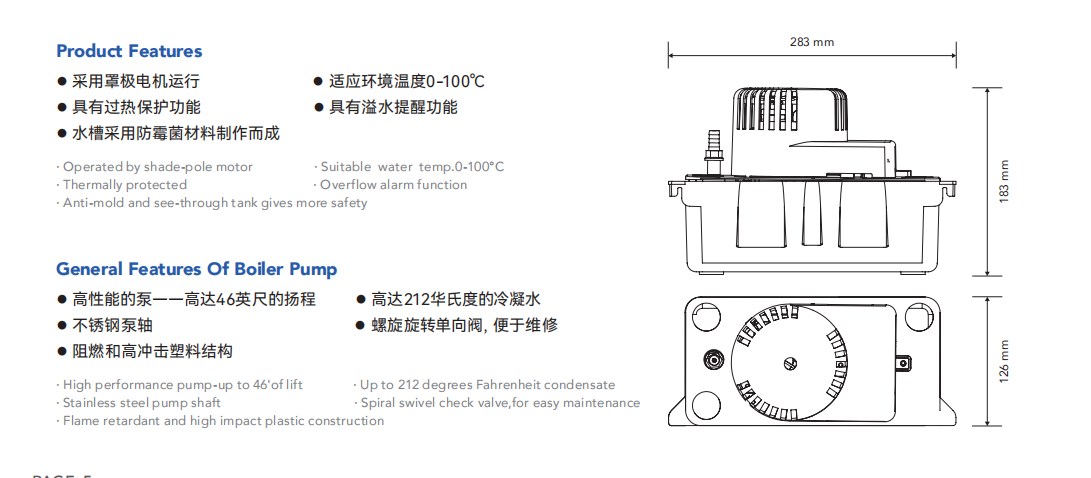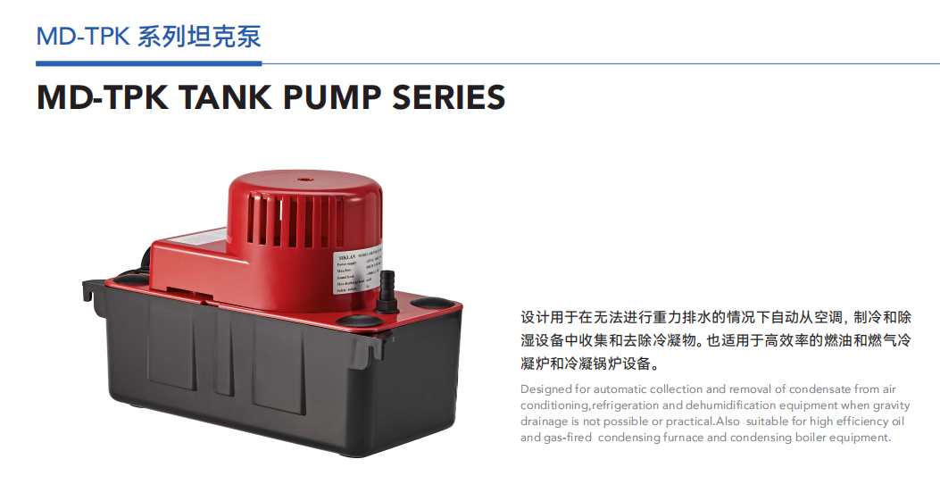 產(chǎn)品簡介:設(shè)計(jì)用于在無法進(jìn)行重力排水的情況下自動(dòng)從空調(diào)、制冷和除濕設(shè)備中收集和去除冷凝物。也適用于高效率的燃油和燃?xì)饫淠隣t和冷凝鍋爐設(shè)備。