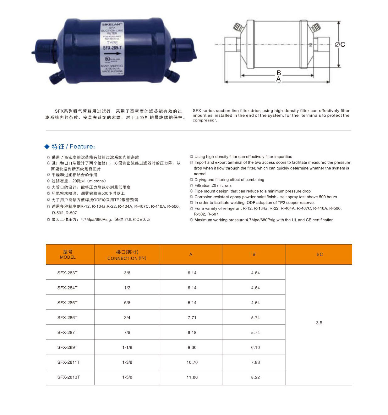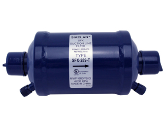 制冷劑按過(guò)濾器上箭頭所批示的方向流動(dòng)時(shí),旁通溢流閥起作用,如果流過(guò)元件時(shí)產(chǎn)生過(guò)大的壓力降,則旁通溢流閥稍微開(kāi)啟,以保持足夠的氣流并使全封閉壓縮機(jī)馬達(dá)得到適當(dāng)?shù)睦鋮s。