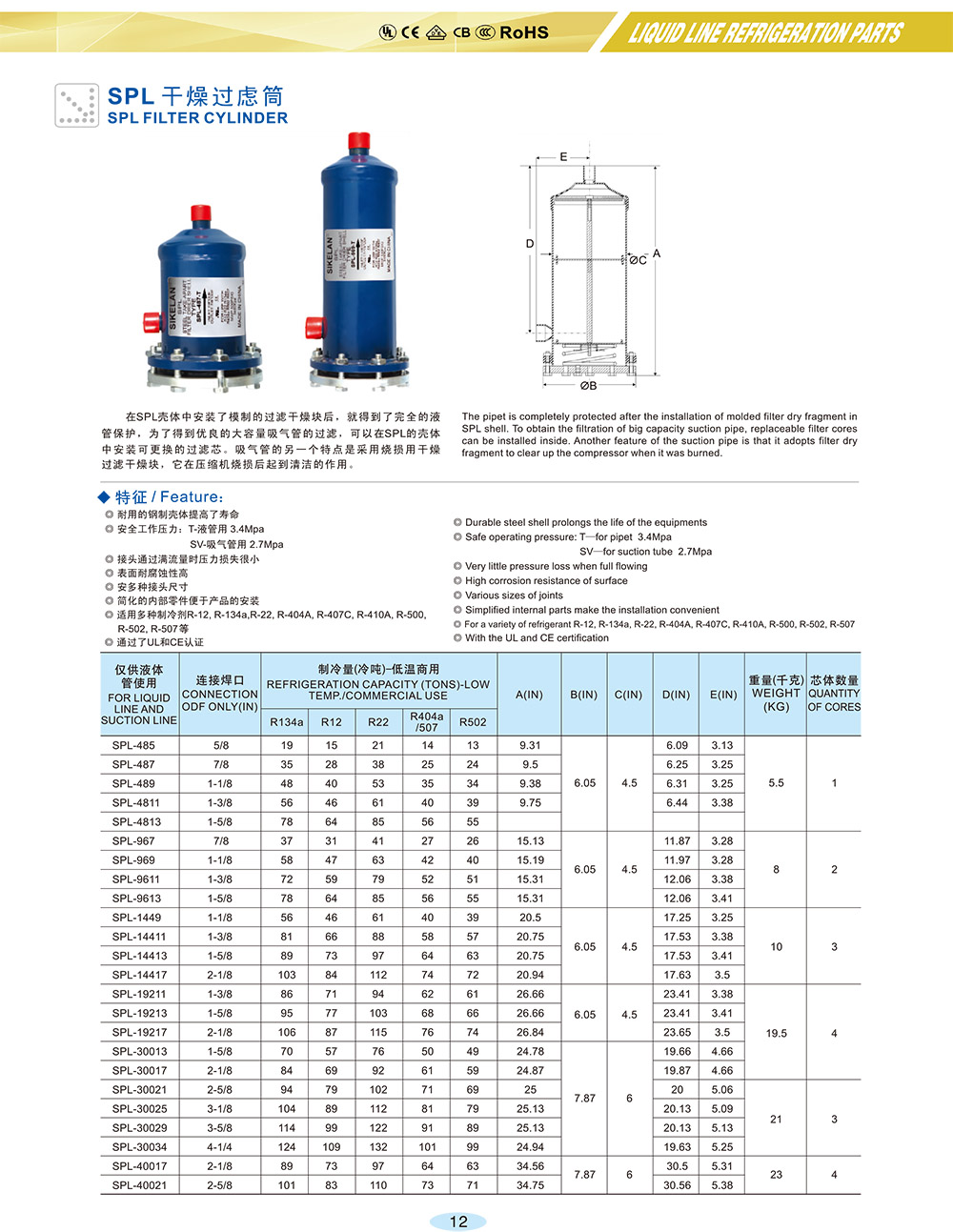 產(chǎn)品簡(jiǎn)介:在SPL殼體中安裝了模制的過濾干燥塊后,就得到了完全的液管保護(hù),為了得到優(yōu)良的大容量吸氣管的過濾,可以在SPL的殼體中安裝可更換的過濾芯。吸氣管的另一個(gè)特點(diǎn)是采用燒損用干燥過濾干燥塊,它在壓縮機(jī)燒損后起到清潔的作用。