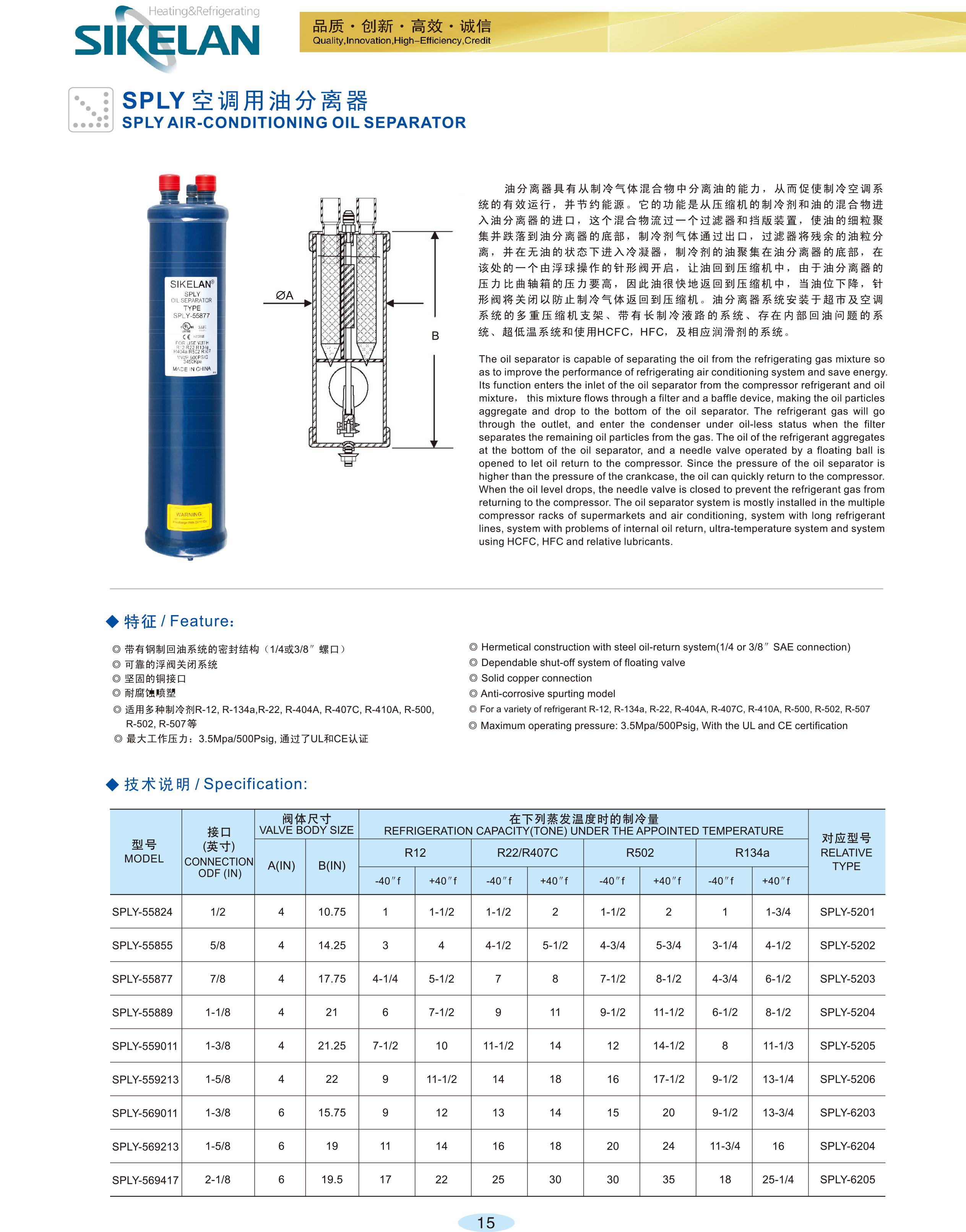 產(chǎn)品簡介:油分離器具有從制冷氣體混合物中分離油的能力,從而促使制冷空調(diào)系統(tǒng)的有效運行。并節(jié)約能源,它的功能是從壓縮機的制冷劑和油的混合物進入油分離器的進口,這個混合物流過一個過濾器和擋版裝置,使油的細粒聚集并跌落到油分離器的底部,制冷劑氣體通過出口,過濾器將殘余的油粒分離,并在無油的狀態(tài)下進入冷凝器,制冷劑的油聚集在油分離器的底部,在該處的一個由浮球操作的針形閥開啟,讓油回到壓縮機中,由于油分離器的壓力比曲軸箱的壓力要高,因此油很快地返回到壓縮機中,當油位下降,針形閥將關(guān)閉以防止制冷氣體返回到壓縮機。油分離器系統(tǒng)安裝于超市及空調(diào)系統(tǒng)的多重壓縮機支架、帶有長制冷液路的系統(tǒng)、存在內(nèi)部回油問題的系統(tǒng)、超低溫系統(tǒng)和使用HCFC,HFC,及相應潤滑劑的系統(tǒng)。