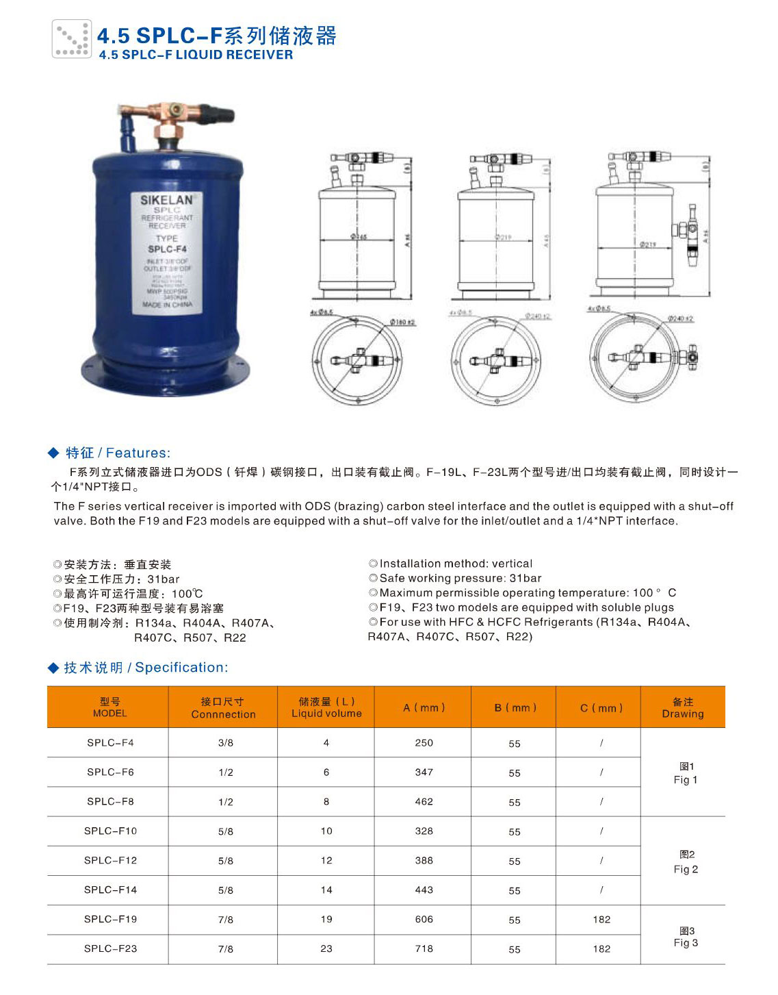 產(chǎn)品簡介:F系列立式儲液器進口為ODS(釬焊)碳鋼接口,出口裝有截止閥。F-19L、F-23L兩個型號進出口均裝有截止閥,同時設計一個1/4"NPT接口。