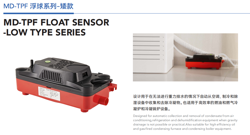 設計用于在無法進行重力排水的情況下自動從空調(diào),制冷和除濕設備中收集和去除冷凝物。也適用于高效率的燃油和燃氣冷凝爐和冷凝鍋爐設備。