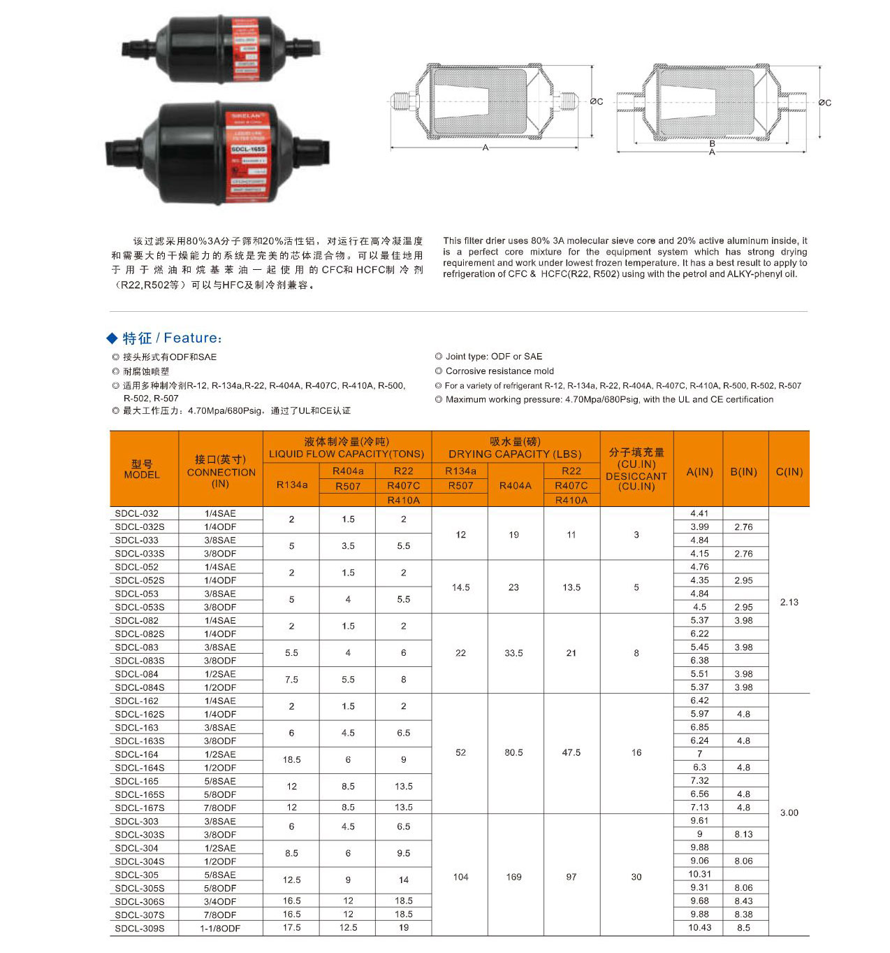 產(chǎn)品簡介:該過濾器采用80%3A分子篩和20%活性鋁,對(duì)運(yùn)行在高冷凝溫度和需要大的干燥能力的系統(tǒng)是最完美的芯體混合物。可以最佳地用于燃油和烷基苯油一起使用的CFC和HCFC制冷劑(R22,R502等)可以與HFC及制冷劑兼容。