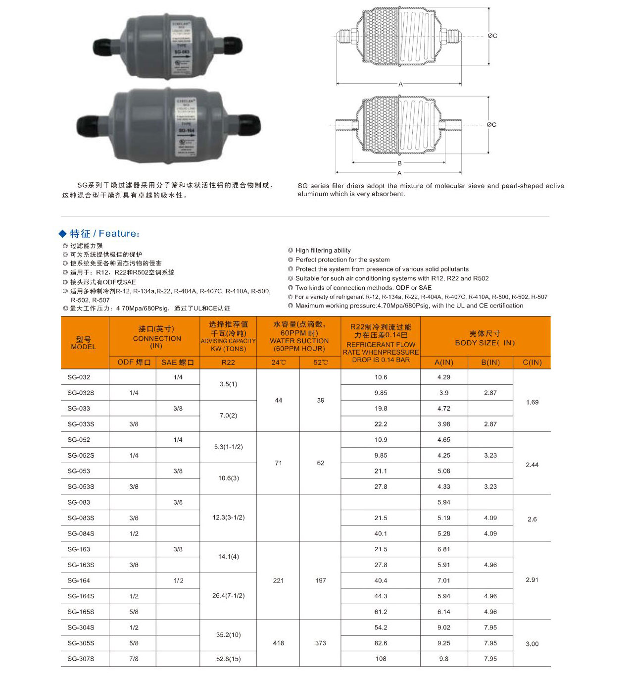 產(chǎn)品簡介:SG系列干燥過濾器采用分子篩和珠狀活性鋁的混合物制成,這種混合型干燥劑具有卓越的吸水性。
