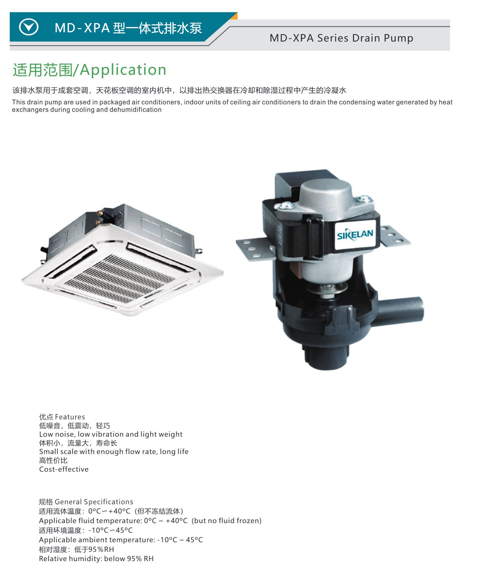 產(chǎn)品簡介:該排水泵用于成套空調(diào),天花板空調(diào)的室內(nèi)機(jī)中,以排出熱交換器在冷卻和除濕過程中產(chǎn)生的冷凝水