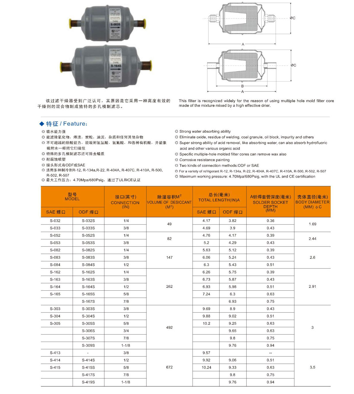 特征:吸水能力強,能濾除氧化物,焊渣,炭粒,油泥,雜質(zhì)和任何其他雜物,不可超越的除酸能力,能吸附氫氯酸,氫氟酸,和各種有機酸,并能象吸附水一樣把它們吸住,特殊的多孔模制濾芯還可除去蠟質(zhì),耐腐蝕噴塑,接頭形式有ODF或SAE,最大工作壓力:4.70Mpa/680psig