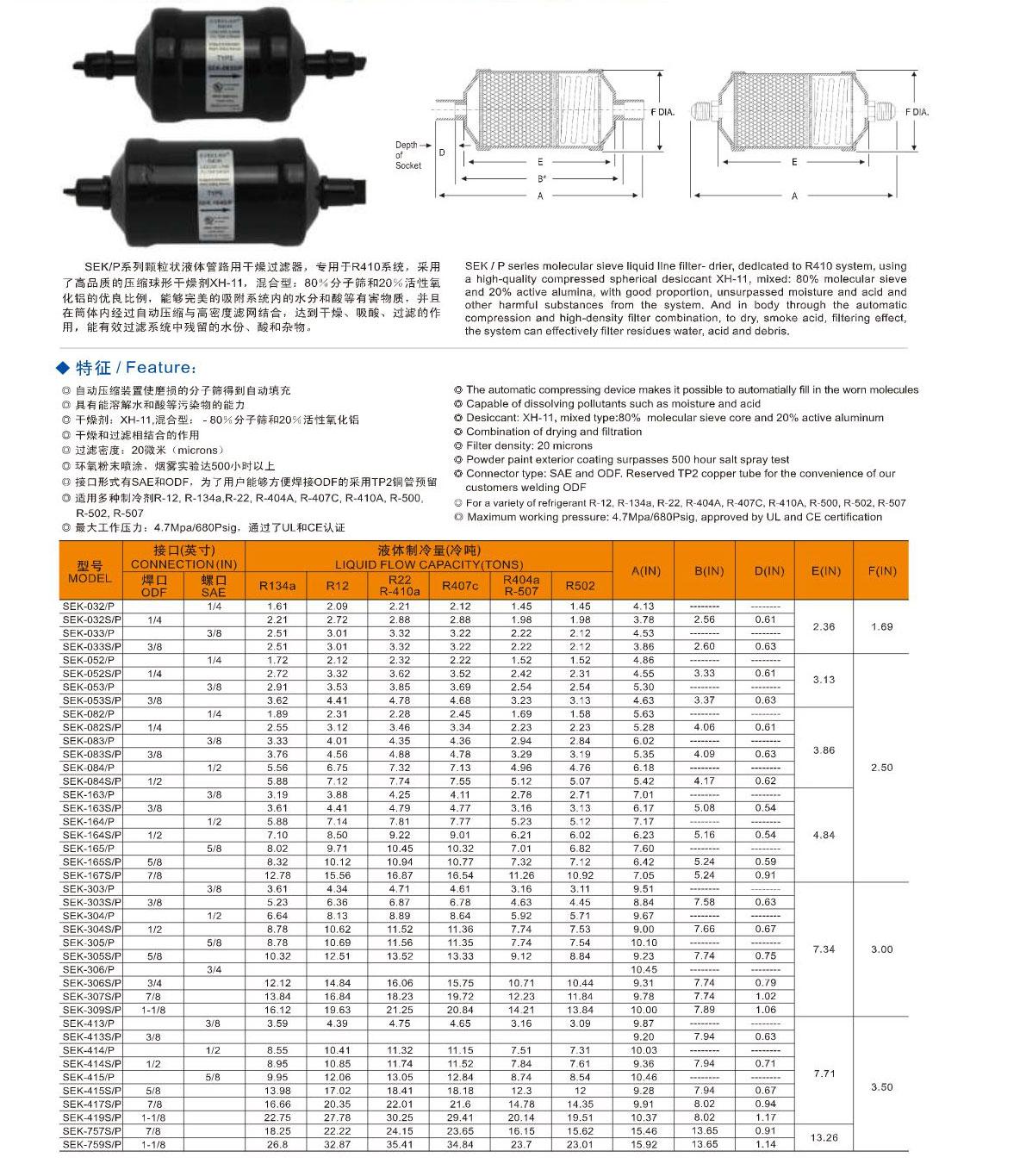特征:自動(dòng)壓縮裝置使磨損的分子篩得到自動(dòng)填充,具有能溶解水和酸等污染物的能力,干燥劑:XH-11混合型:-80%分子篩和20%活性氧化鋁,干燥和過(guò)濾相結(jié)合的作用。過(guò)濾密度:20微米(microns),環(huán)氧粉末噴涂、煙霧試驗(yàn)達(dá)500小時(shí)以上,接口形式有SAE和ODF。為了用戶能夠方便焊接ODF的采用TP2銅管預(yù)留。適用多重制冷劑R-12,R-134a,R-22,R-404A,R-407C,R-410A,R-500,R-502,R-507。最大工作壓力:4.7Mpa、680Psig,通過(guò)了UL和CE認(rèn)證。